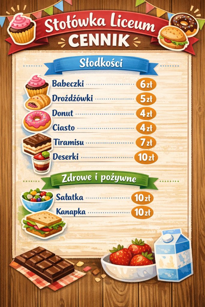 17-24 kwietnia 2026 Twoje Szkolne Menu – Liceum Piątek17 kwietnia 2026 Poniedziałek20 kwietnia 2026 Wtorek21 kwietnia 2026 Środa22 kwietnia 2026 Czwartek23 kwietnia 2026 Piątek24 kwietnia 2026 LISTA ALERGENÓW Masz pytania? Zadzwoń! 606 918 255